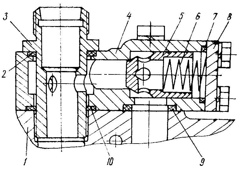 Отверните два болта крепления корпуса 4 ( рис. 329 ) обратного клапана 5 к корпусу распределителя 1. Выверните штуцер 3, перемещая его вместе с корпусом 4. Снимите корпус и уплотнительные кольца 2, 9 и 10. Отверните четыре болта и снимите крышку 8. Выньте из корпуса 4 кольцо 7, пружину 6 и клапан 5.