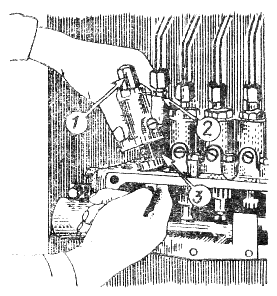 Снимите крышку смотрового люка насоса. Отверните болт, снимите поводок, соединяющий рейку с тягой насоса. Отверните два болта и удалите планки, удерживающие рейку в пазах блока насоса. Затем выньте рейку из корпуса насоса. Отверните болты и удалите прижимные угольники, крепящие секцию к блоку насоса. Приподнимите секцию вверх и снимите ее с установочных штифтов. Просуньте палец в смотровой люк, удерживая плунжер от выпадения из гильзы, передвиньте секцию в сторону так, чтобы конец плунжера вышел из паза регулировочного винта толкателя. Выньте секцию насоса и заглушите отверстие подвода топлива предохранительной пробкой 3.