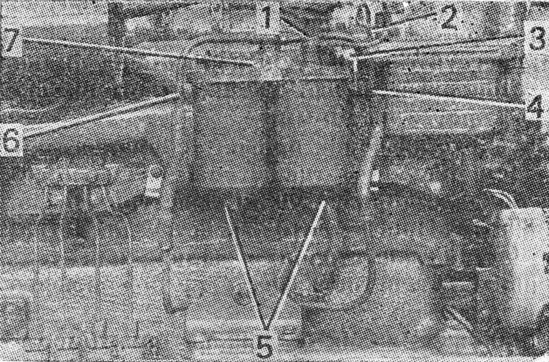 Наденьте на шпильки прилива водоотводной трубы топливный фильтр 7 ( см. рис. 146 ) и закрепите его двумя гайками с пружинными шайбами. Подсоедините: топливопроводы 4 и 6 к корпусу фильтра; сливную трубку 2 к продувочному вентилю 1; провод к датчику 3 указателя давления топлива.