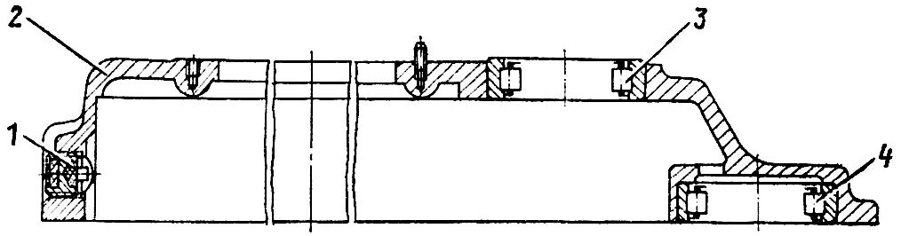 Запрессуйте в кожух 2 ( рис. 265 ) бортового редуктора наружные кольца роликоподшипников 3 и 4. Разукомплектовка колец подшипников не допускается. Внутренние и наружные кольца подшипников должны иметь одинаковую маркировку. Вверните в кожух бортового редуктора магнитную пробку 1.