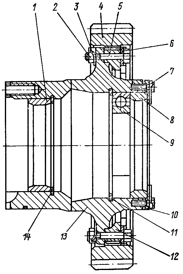 Установите ступицу фланцем вверх. Установите на неё венец 12 ( см. рис. 252 ). Наденьте на венец шестерню 4. Наденьте на болты 5 планки 6 и запрессуйте болты в отверстия венца и ступицы. Установите в канавку ступицы кольцо И и запрессуйте шарикоподшипник 9 до упора в кольцо. Запрессуйте в ступицу наружное кольцо 8 роликоподшипника до упора в шарикоподшипник. Установите крышку 10 и закрепите ее восемью, болтами со стопорными пластинами 7. Момент затяжки болтов 40...60 Н•м (4...6 кгс • м). Отогните концы стопорных пластин на грани головок болтов. Переверните ступицу фланцем вниз. Наденьте на болты 5, запрессованные в отверстия венца и ступицы, стопорные пластины 3 отогнутыми концами вверх и наверните на болты гайки 2. Момент затяжки гаек 200...300 Н • м (20...30 кгс-м). Отогните концы пластин на грани гаек. Установите стопорное кольцо 14 в канавку ступицы. Запрессуйте наружное кольцо 1 роликоподшипника до упора в стопорное кольцо.