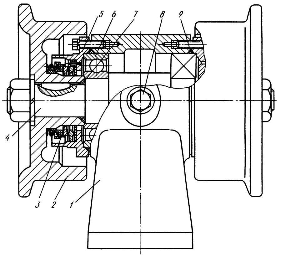 Полость натяжного колеса уплотнена резинометаллическим сальником 5, аналогичным применяемому в опорных и поддерживающих катках и отличающимся размерами.