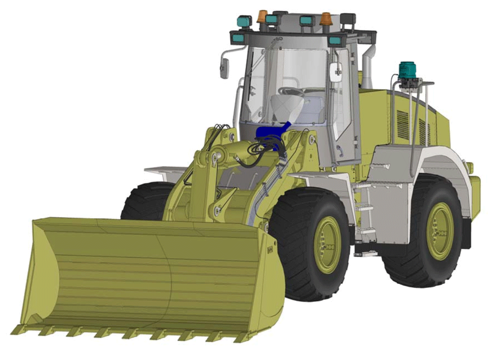 Выдвижение штоков гидроцилиндров увеличивает высоту подъема (разгрузки) ковша относительно рычажной системы (общая высота разгрузки по ковшу 4890 мм вместо 3010 мм для серийного).